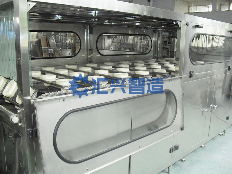 灌裝機構(gòu)采用的是微負壓灌裝方式。這種方式的優(yōu)點在于液位的精準,無論灌裝量為250ml或者是1500ml,都可以實現(xiàn)滿灌裝。所以這臺CGF型三合一體機不僅可以灌水,還可以灌果汁等飲料。