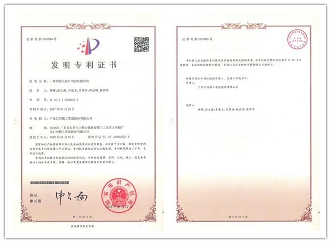 隨著科技進步與技術創新不斷發展,自主知識產權儲備,尤其是創造性較高的發明專利已成為企業發展的核心競爭力。近日,廣東匯興精工智造股份有限公司(股票代碼:839258)又新增一項發明專利——《一種陶瓷馬桶自動存胚輸送線》。