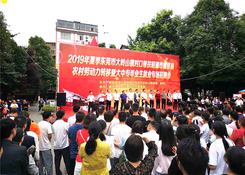 為進一步做好威信縣勞動力轉移就業工作,扎實推進東莞大嶺山鎮對口幫扶威信扶貧工作,加強兩地的勞務協作,助推威信脫貧攻堅。日前,威信縣委、政府及東莞市大嶺山鎮黨委、政府舉辦了“2019年夏季東莞市大嶺山鎮對口幫扶威信縣農村勞動力轉移就業專場招聘會”。