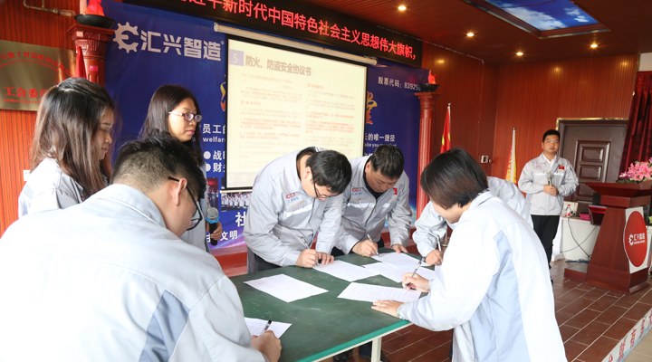 璞玉有瑕,有先進(jìn),就有落后,有表揚(yáng),就有懲戒。沒有規(guī)矩,不成方圓,所以大會(huì)的第四個(gè)議程對(duì)公司管理制度做了進(jìn)一步宣講和引導(dǎo)。人事經(jīng)理袁侃結(jié)合實(shí)際案列,諄諄告誡全體員工遵守法律、行政法規(guī)、公司制度,不要以身試法、以身犯險(xiǎn)。并發(fā)起第五個(gè)會(huì)議議程,倡議匯興智造全體員工簽訂《防火、防盜安全協(xié)議書》,各部門負(fù)責(zé)人率先上臺(tái)在協(xié)議書上簽字,用實(shí)際行動(dòng)表決心。