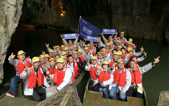 旅途第三站:洞天仙境。洞口有一巨大的鐘乳石向下垂吊,從巖洞口乘船而入,在眾多奇姿怪態的鐘乳間穿掠。穿過一段狹窄的地方進入到洞內,視野豁然開朗,有綠樹、蔓草、野花,抬頭仰望,洞中有天,洞天相連,讓人嘆為觀止?!皦粝胫谩钡膱F隊成員們在感嘆大自然的神奇時,也表示天外有天,人外有人,只有不斷前行,才有更廣闊的天地。邊走邊看,邊看邊想,“夢想之旅”讓匯興智造的骨干們看得更遠,想得更深,真是不虛此行。