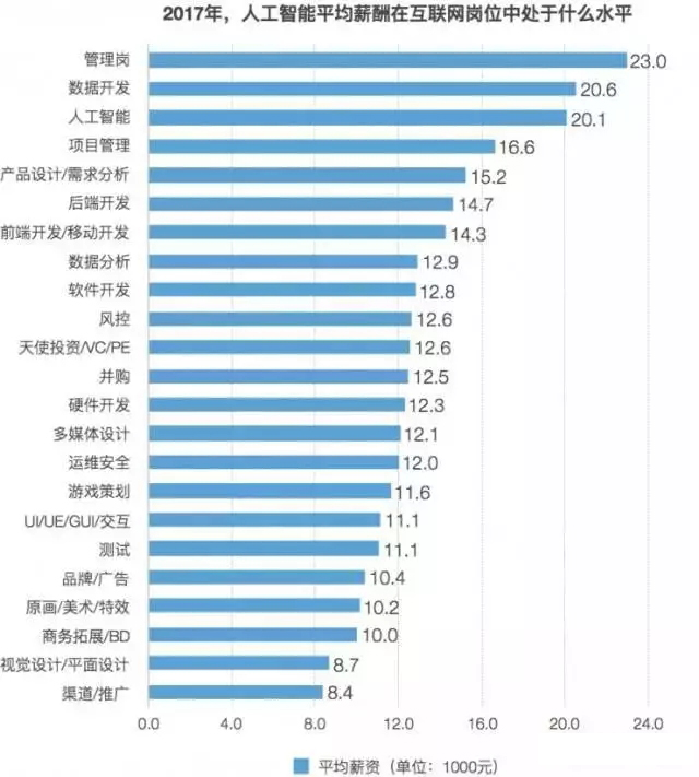 數據顯示,管理崗在各崗位中薪酬最高,平均達到 23k,數據開發和人工智能緊隨其后,都在 20k 以上。
