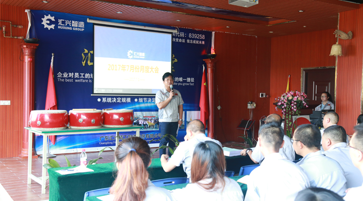 光陰似箭,轉眼間,2017年上半年已經過去了。在2017年7月1日這個有著諸多紀念意義的日子里,廣東匯興精工智造股份有限公司(股票代碼:839258)月度大會在東莞總部勝利召開,匯興智造董事長鐘輝及公司全體員工精神抖擻、斗志昂揚地參加了此次會議。大會在催人奮進的匯興之歌中拉開了帷幕,人資行政部經理袁侃主持本次會議。